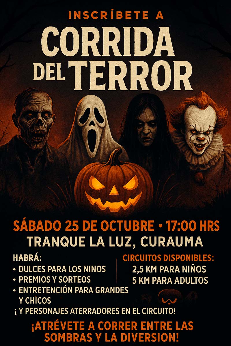 ¡No te pierdas la Corrida del Terror 2025! Este sábado 25 de octubre a las 17:00 hrs, en el Tranque La Luz, Curauma, llega una experiencia llena de emociones, sustos y diversión para toda la familia.
