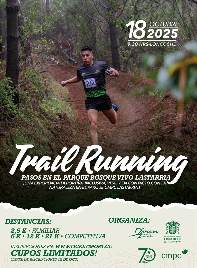 ¡No te pierdas “Pasos en el Parque Vivo”! El próximo sábado 18 de octubre de 2025, en el hermoso Parque CMPC Lastarria de Loncoche, se vivirá una experiencia única para amantes del trail running y la naturaleza. Organizado por el Club Deportivo Lafken Loncoche y con el apoyo del Hospital de Loncoche y la Municipalidad local, este evento promete adrenalina, paisajes increíbles y una jornada inolvidable.